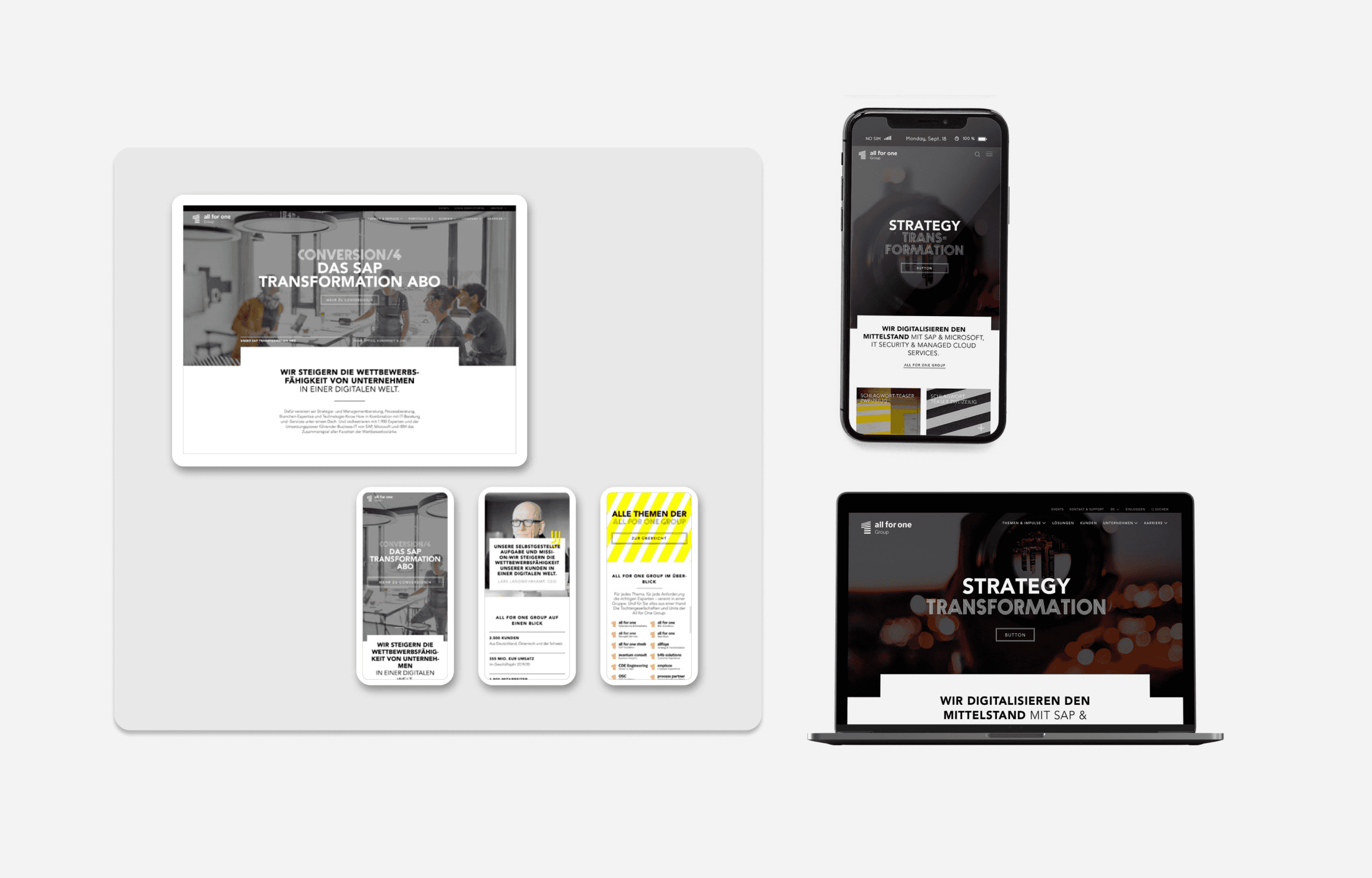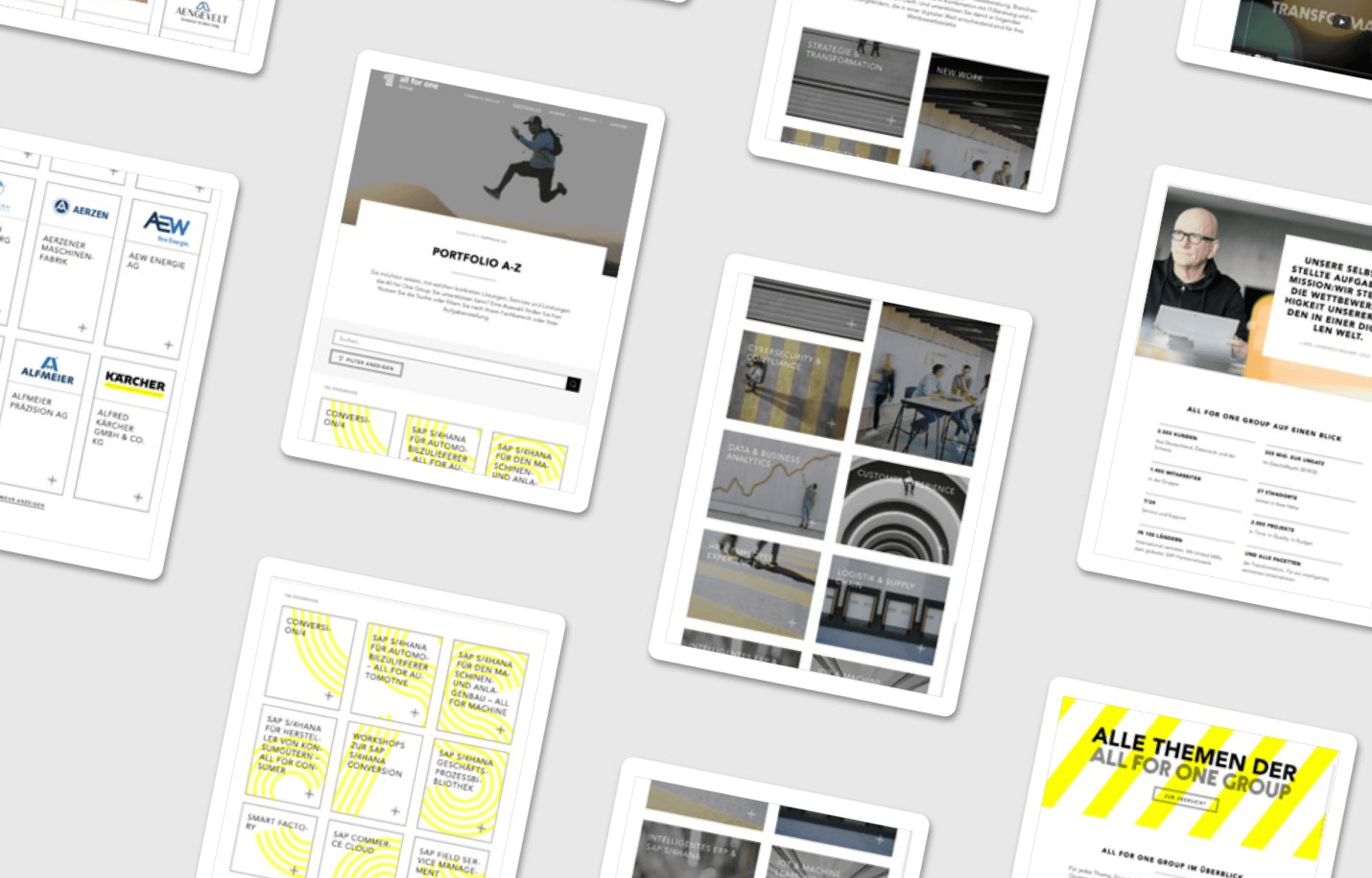 For the All for One Group, we had the opportunity to completely rebuild the brand identity—retaining only the original logo. The rebranding spanned digital platforms and physical media, from the website and eBooks to brochures, icons, and trade show exhibitions.