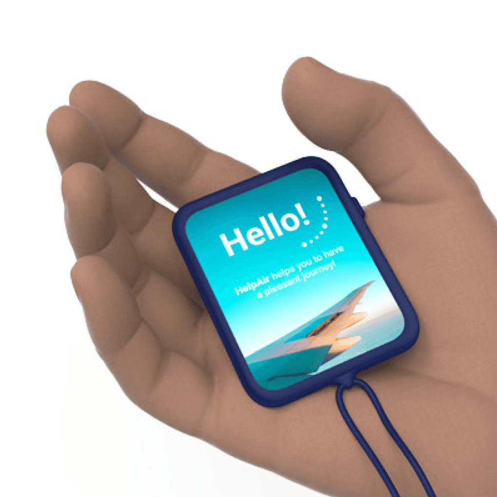 After conducting interviews and identifying user needs, the concept of HelpAir was developed. HelpAir is a small, hands-free device worn around the user’s neck, leaving their hands free for children, luggage, or other items. With a simple touchscreen and a single button, it requires no complex instructions, ensuring immediate usability.
