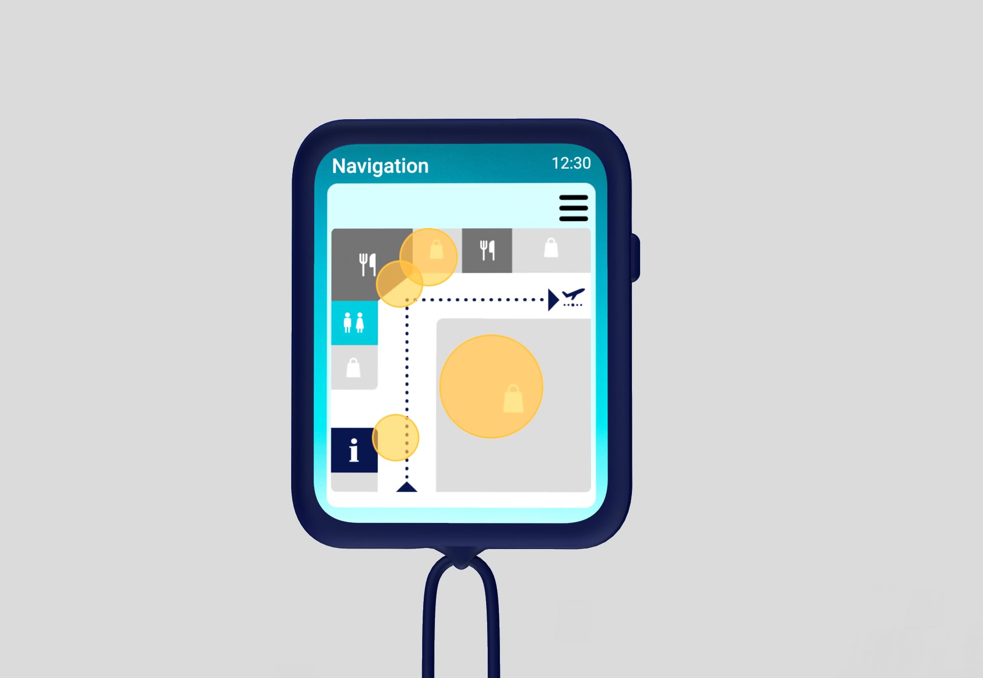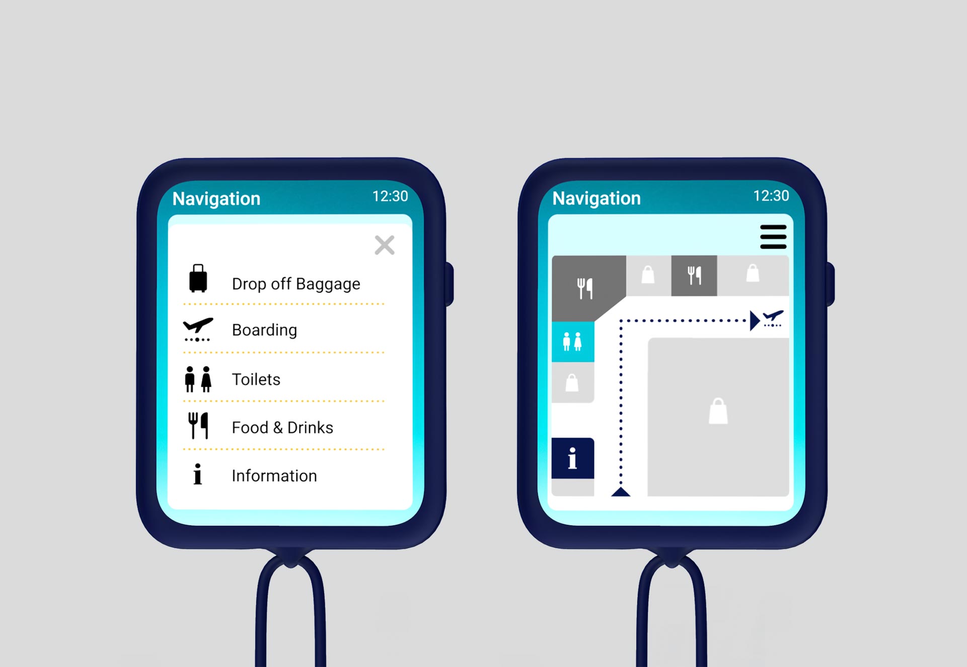 To optimize usability, we created multiple mockups to test interaction ease. The device operates through familiar swipe motions, much like a smartphone. The screen design is clear and intuitive, with consistent color choices and icons for easy understanding. The back of the device is dark blue, matching Lufthansa’s brand colors, and is made of silicone for a secure grip. The concept was visualized as a digital low-fidelity prototype.